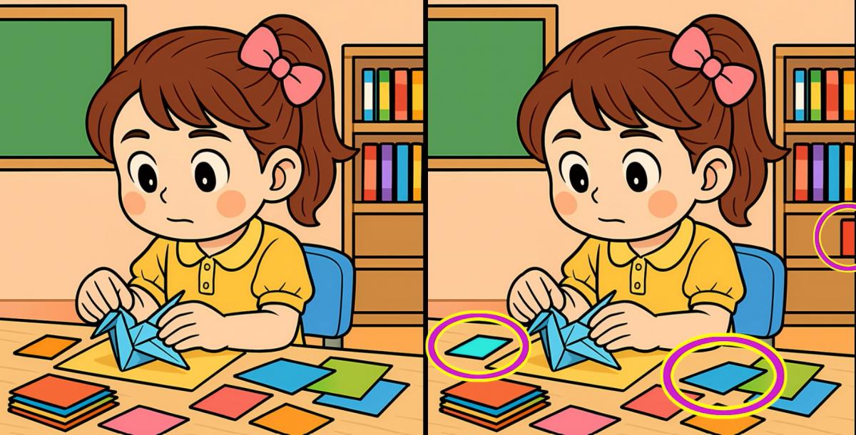 Tak co, jste připraveni na další výzvu? Podívejte se pozorně na dva obrázky dívky, která vyrábí papírové ptáčky. Na první pohled mohou vypadat stejně, ale jsou mezi nimi tři malé rozdíly. Myslíte si, že je všechny najdete za 19 sekund? Zkuste to a otestujte svou ostrost zraku!