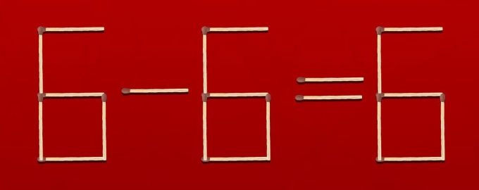Tento rychlý IQ-test nabízí opravu nesprávné matematické rovnosti provedením jediného pohybu. Příklad před vámi je 6 – 6 = 6, složený z 21 zápalek, což ještě nedává logický smysl. Úkolem je přetáhnout pouze jednu zápalku a rovnost změnit na správnou.