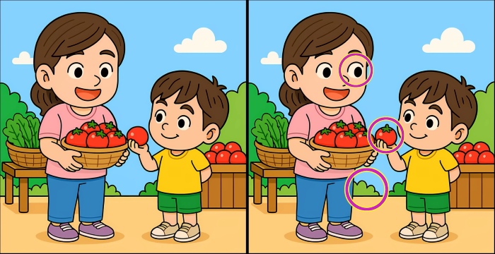 Tak co, jste připraveni na další výzvu? Podívejte se pozorně na dva obrázky matky a syna, kteří sbírají rajčata. Na první pohled mohou vypadat stejně, ale jsou mezi nimi tři malé rozdíly. Myslíte si, že je všechny najdete za 45 sekund? Zkuste to a otestujte svou ostrost zraku!