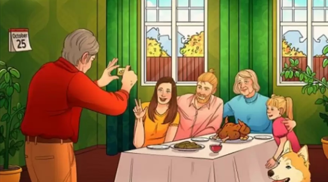 Datum v kalendáři by mělo být 22. října. Na obrázku je rodina slavící Den díkůvzdání, což naznačuje pečený krocan – tradiční pokrm tohoto svátku. Na Ukrajině připadá Den díkůvzdání na 22. října.
