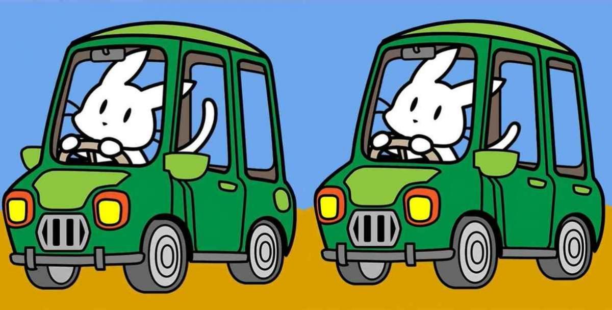 Zobrazeny jsou dva obrázky. Na obou je zobrazen králík, který řídí zelené auto. Naším úkolem je najít tři rozdíly mezi druhým a prvním obrázkem.