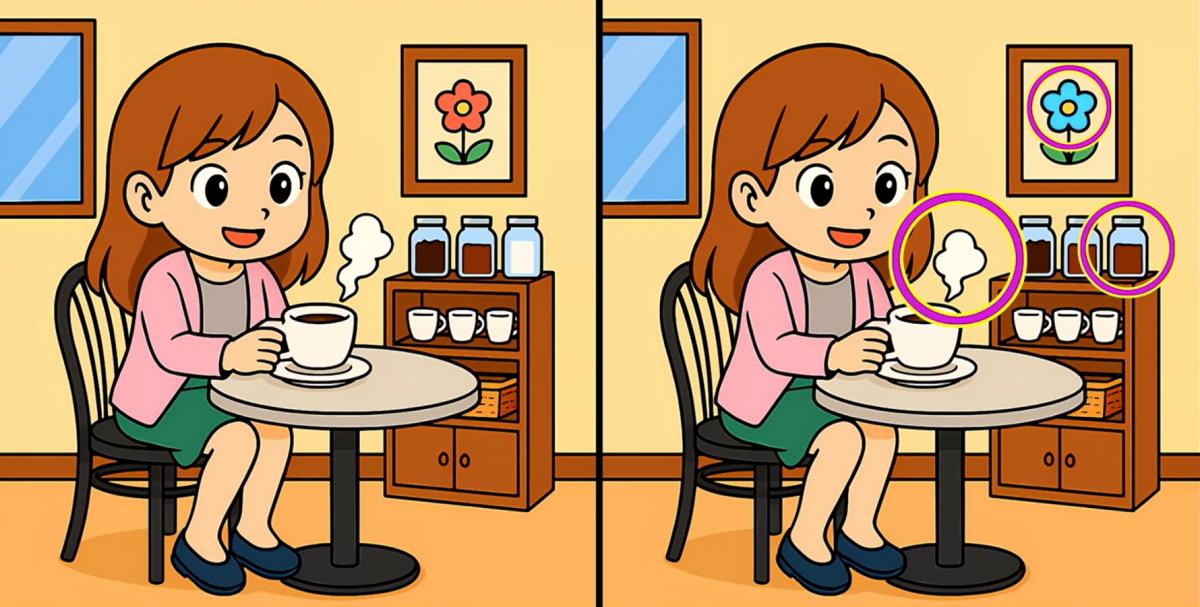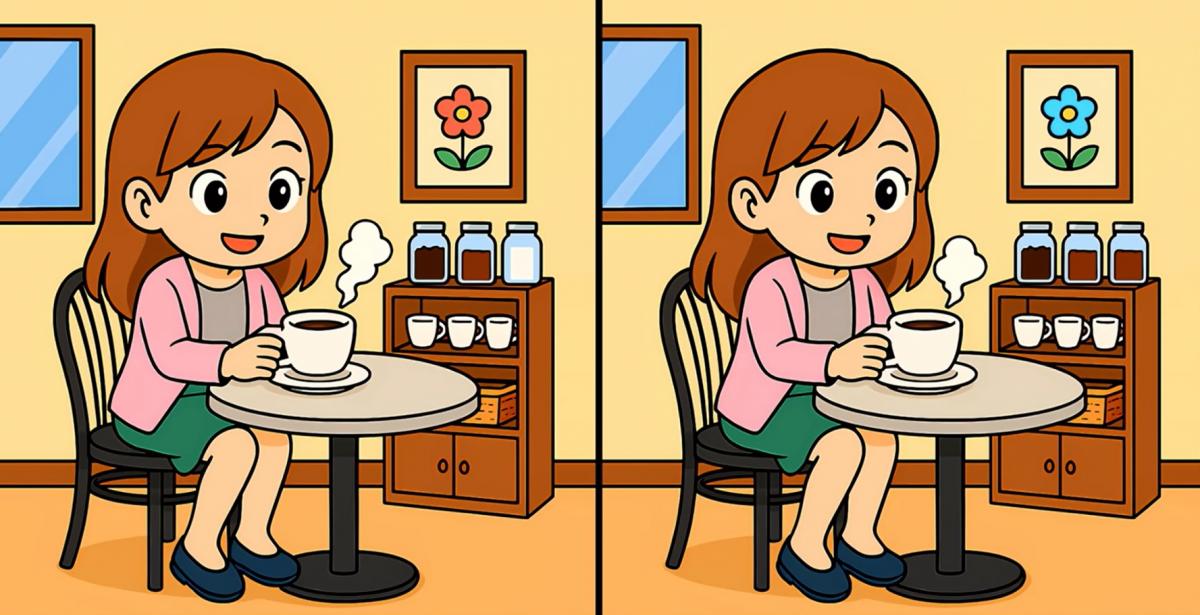 Tak co, jste připraveni na další úkol? Podívejte se pozorně na dva obrázky dívky pijící kávu. Na první pohled mohou vypadat stejně, ale jsou mezi nimi tři malé rozdíly. Myslíte si, že je všechny najdete za 19 sekund? Zkuste to a otestujte svou ostrost zraku!