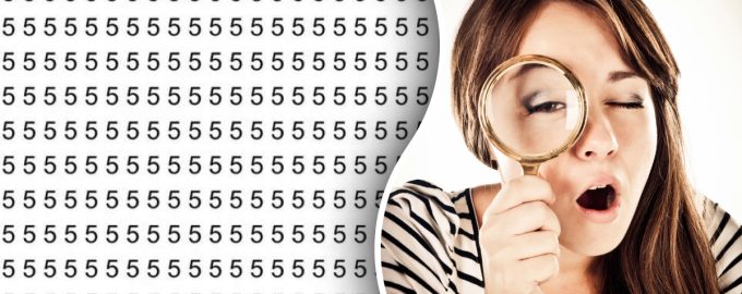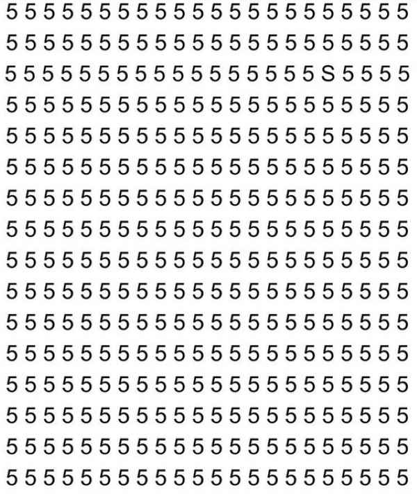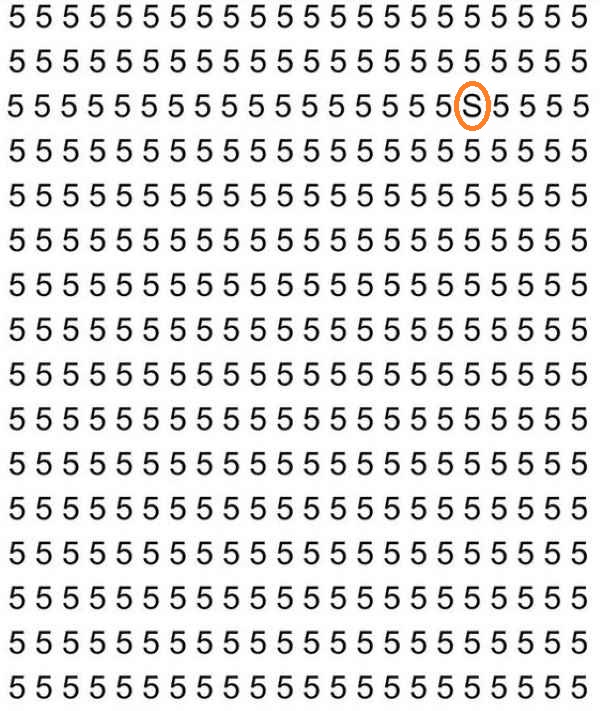 Na obrázku vidíme velké množství číslic 5, které jsou uspořádány v řadách a sloupcích. Pokud se na tento obrázek podíváte, může se vám z prvních vteřin zdát, že písmeno S nikde rozhodně není. Tomuto prvnímu dojmu však není radno věřit – určitě tam je, jen není tak snadné si ho všimnout.