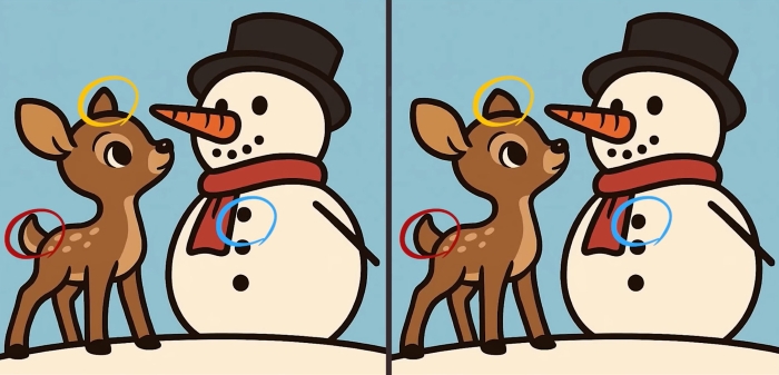 Tak co, jste připraveni na další výzvu? Podívejte se pozorně na dva obrázky sněhuláka a soba. Na první pohled se může zdát, že jsou obrázky totožné, ale jsou zde tři malé rozdíly. Myslíte si, že je všechny najdete za 75 sekund? Zkuste to a otestujte svou ostrost zraku!
